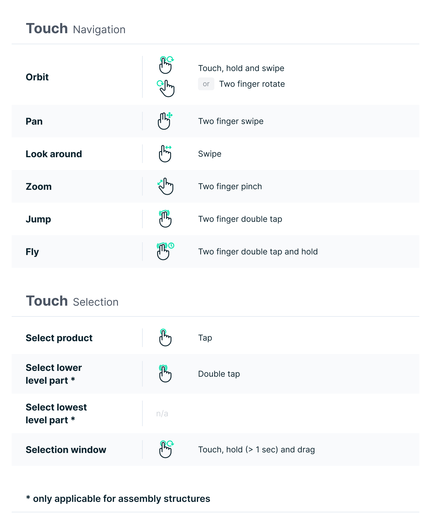Using a touch device? You can navigate your model and select entities by using the following gestures.