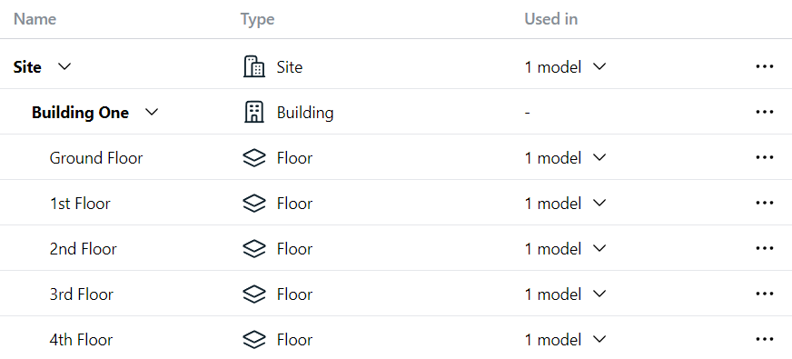 For every location the name is displayed, as well as the type and the number of models that reference this location. It is possible to share the same location over multiple models, for instance when working with different discipline models of the same building.