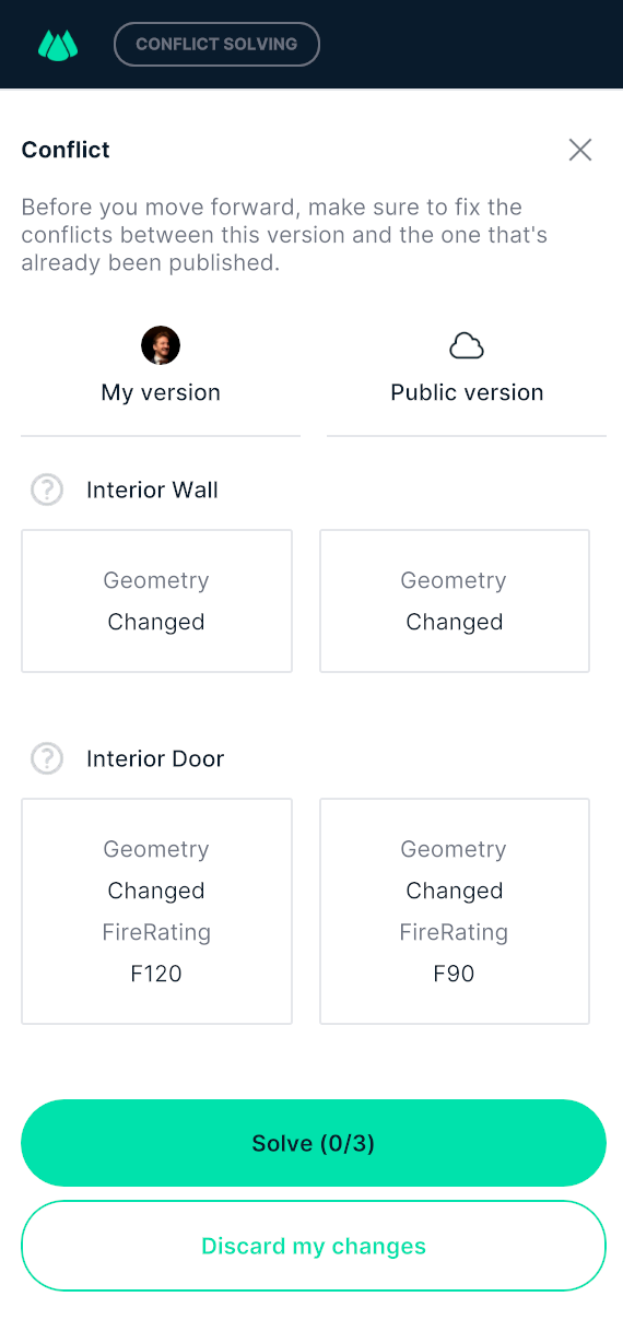 Solve conflicts: open the model in a dedicated 'conflict solving' mode. Here you will see a list of all conflicting changes, with an option to choose between the two versions of each change. On the left-hand side you will see your own version of the change, on the right-hand side you will see the latest public version of the change. You can solve each conflict individually by clicking either of the two options. Once all conflicts have been resolved, the 'conflict solving' mode will be closed and you can continue working as normal.