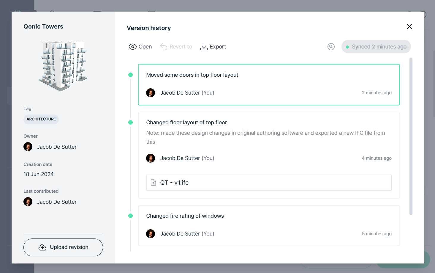 Qonic supports uploading revisions of IFC files in the same version history of a model. In the version history of a model, click Upload Revision in the bottom left of the screen.